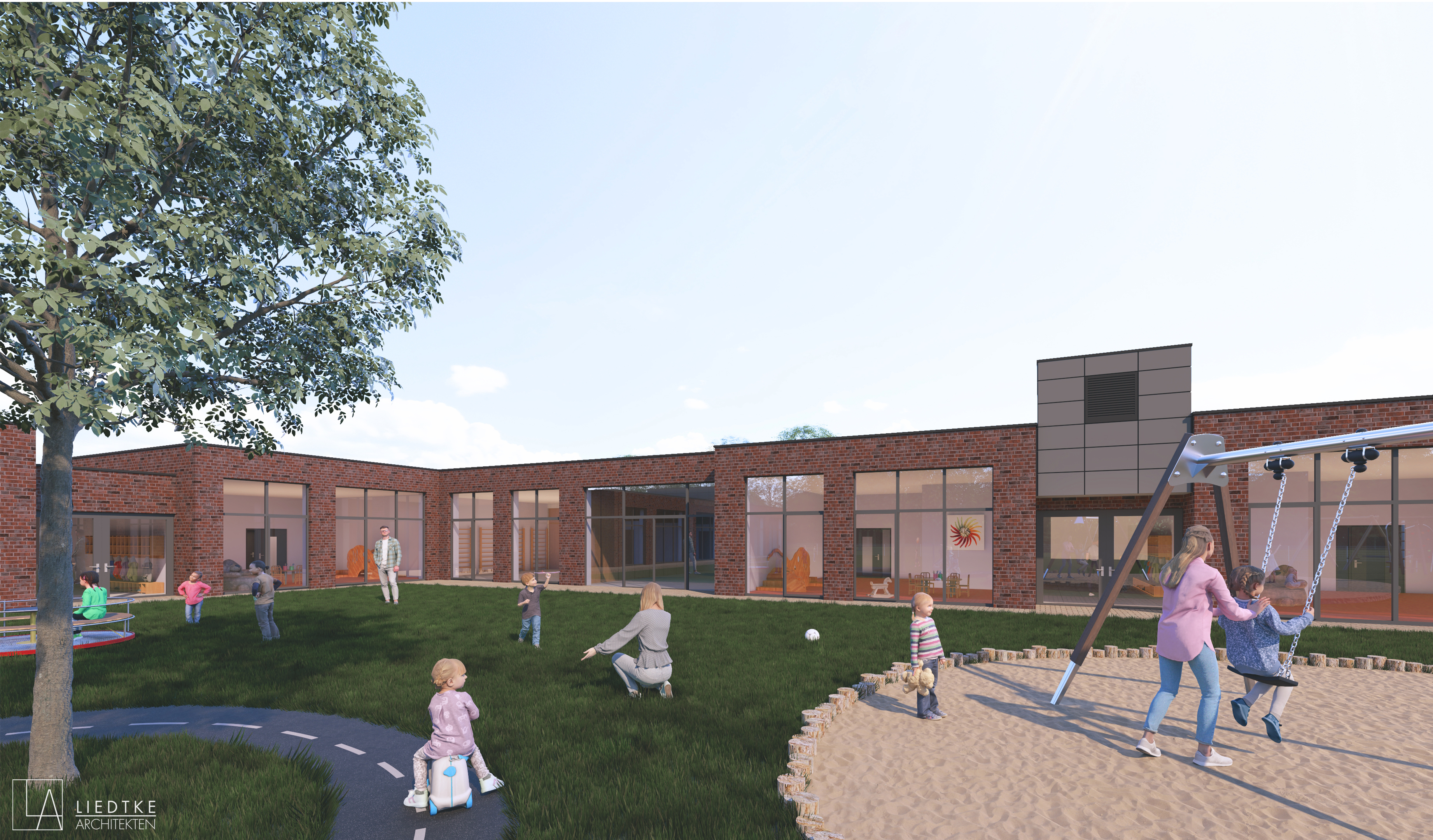 Auf dem rund 8.300 m² großen Grundstück entstehen moderne und großzügige Räume für insgesamt sechs Kita-Gruppen auf einer Grundfläche von ca. 1500 m².