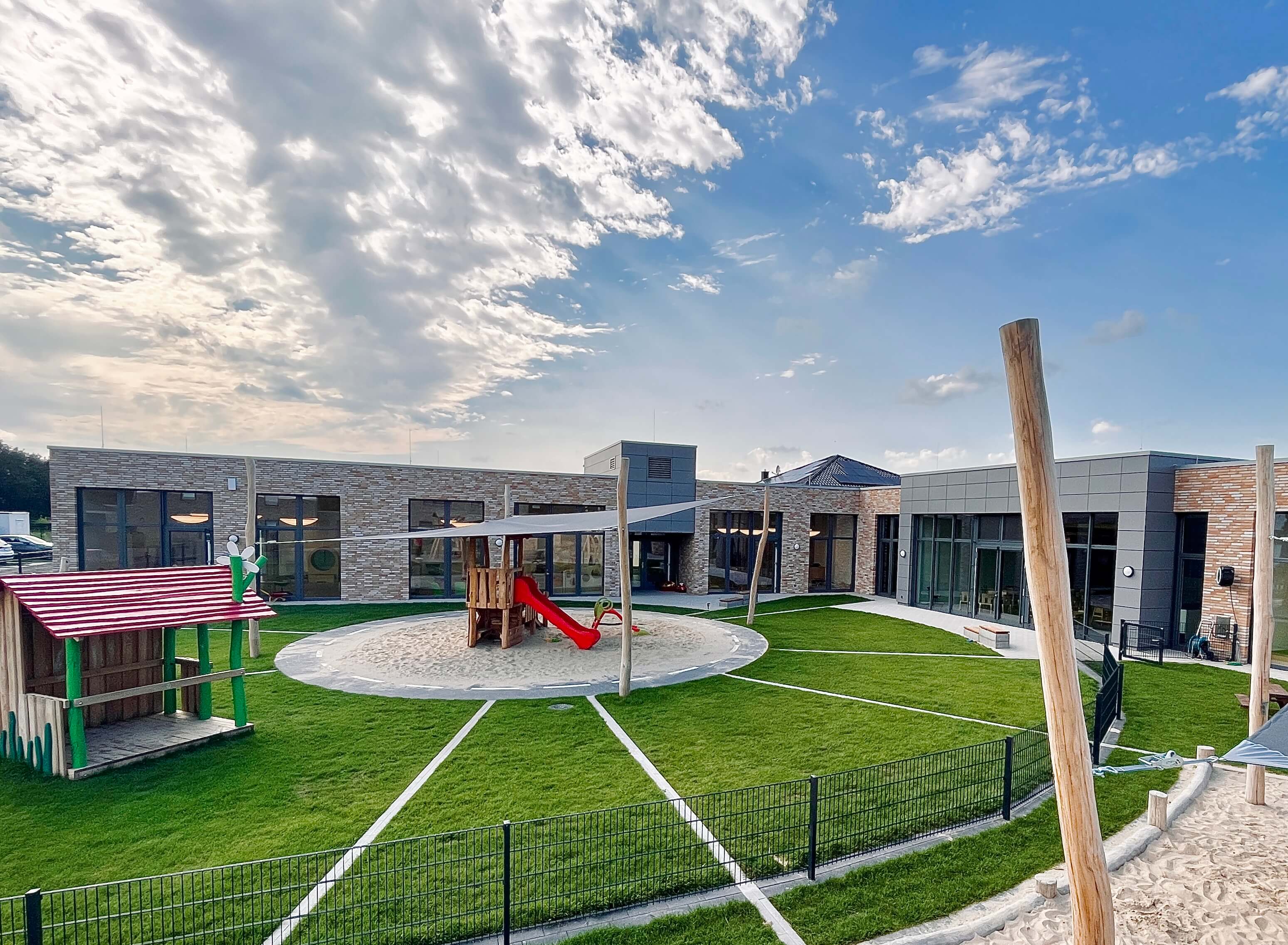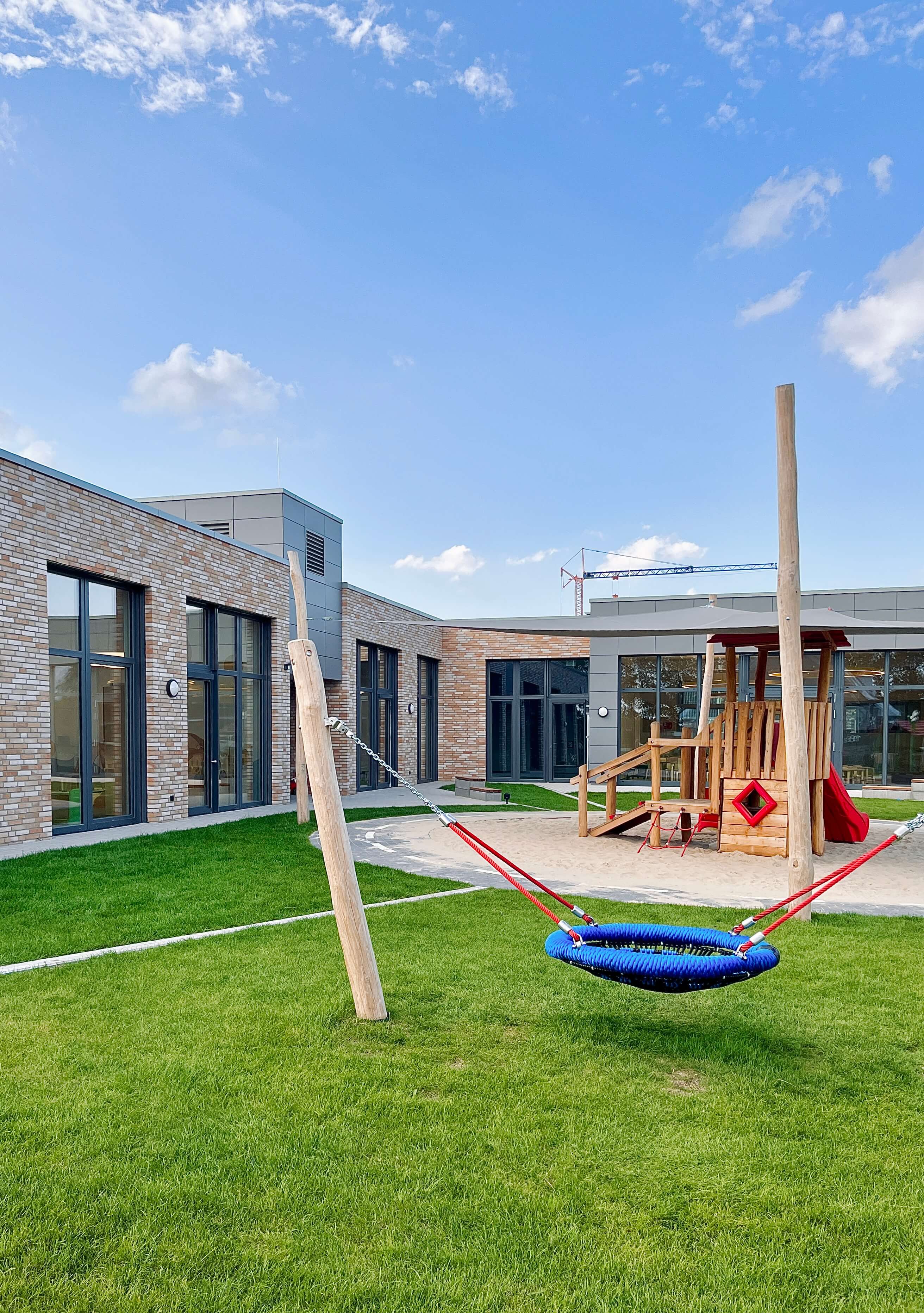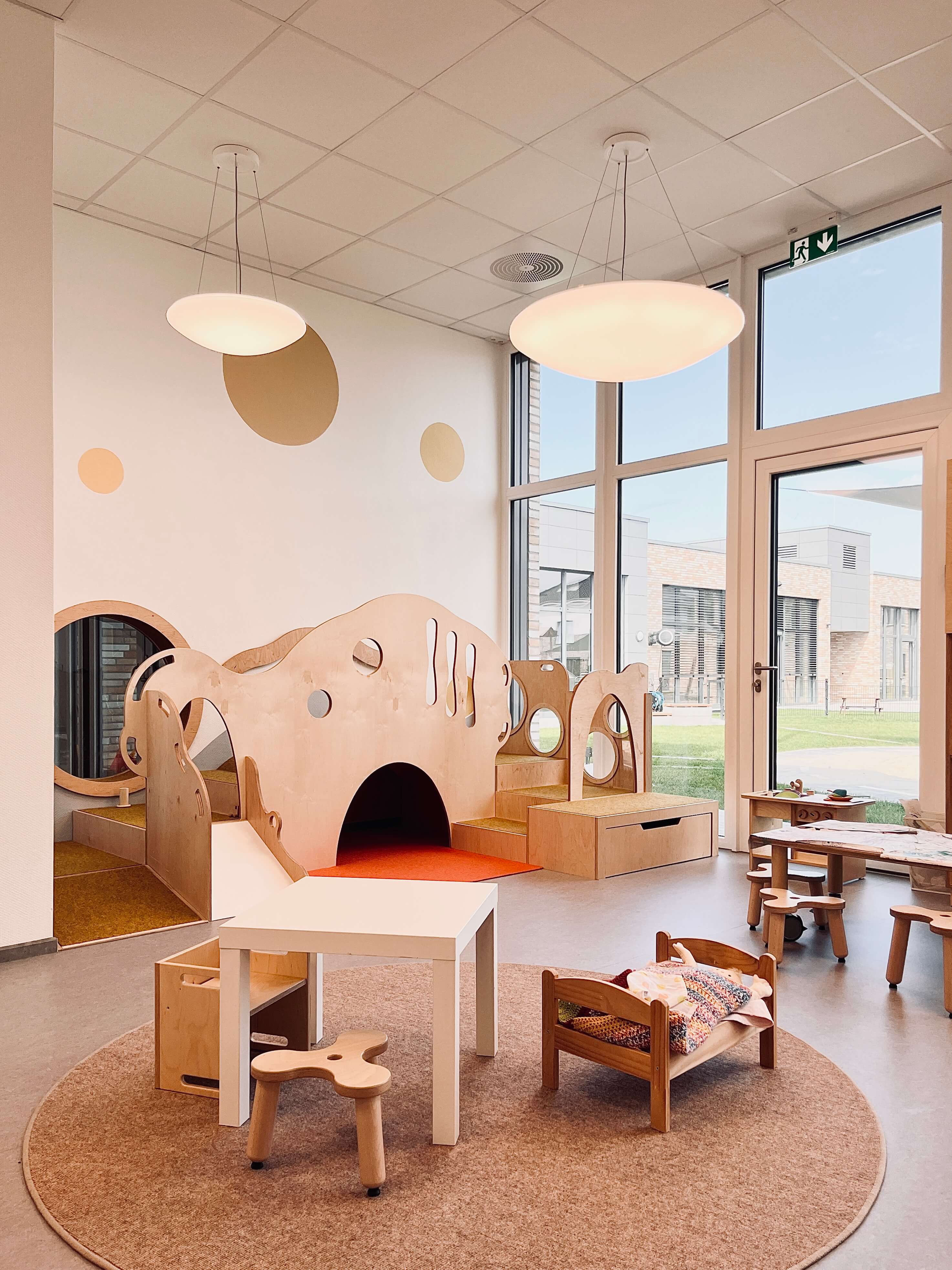 Im Laufe der Planungen wurden aus den ursprünglich nur 3 geplanten Gruppen dann insgesamt 5. Es sollten sowohl 3 Krippengruppen als auch 2 Regelgruppen entstehen. Somit ist innerhalb von 17 Monaten ein modernes, funktionales und zukunftsweisendes Gebäude mit 1.150 qm Nutzfläche entstanden.